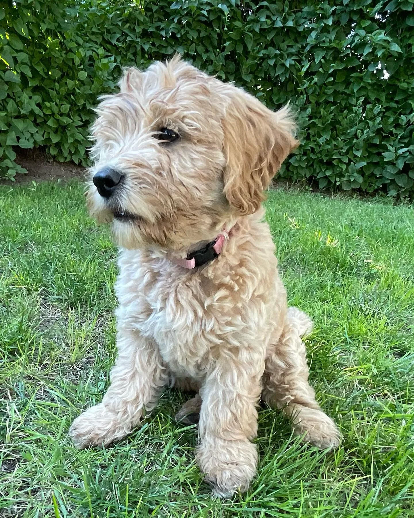 Maz is a mini Doubledoodle. She is a pup from our retired Nanu and Parker. Ms. Maz is 20lbs and measures 15" from floor to the top of her shoulders.